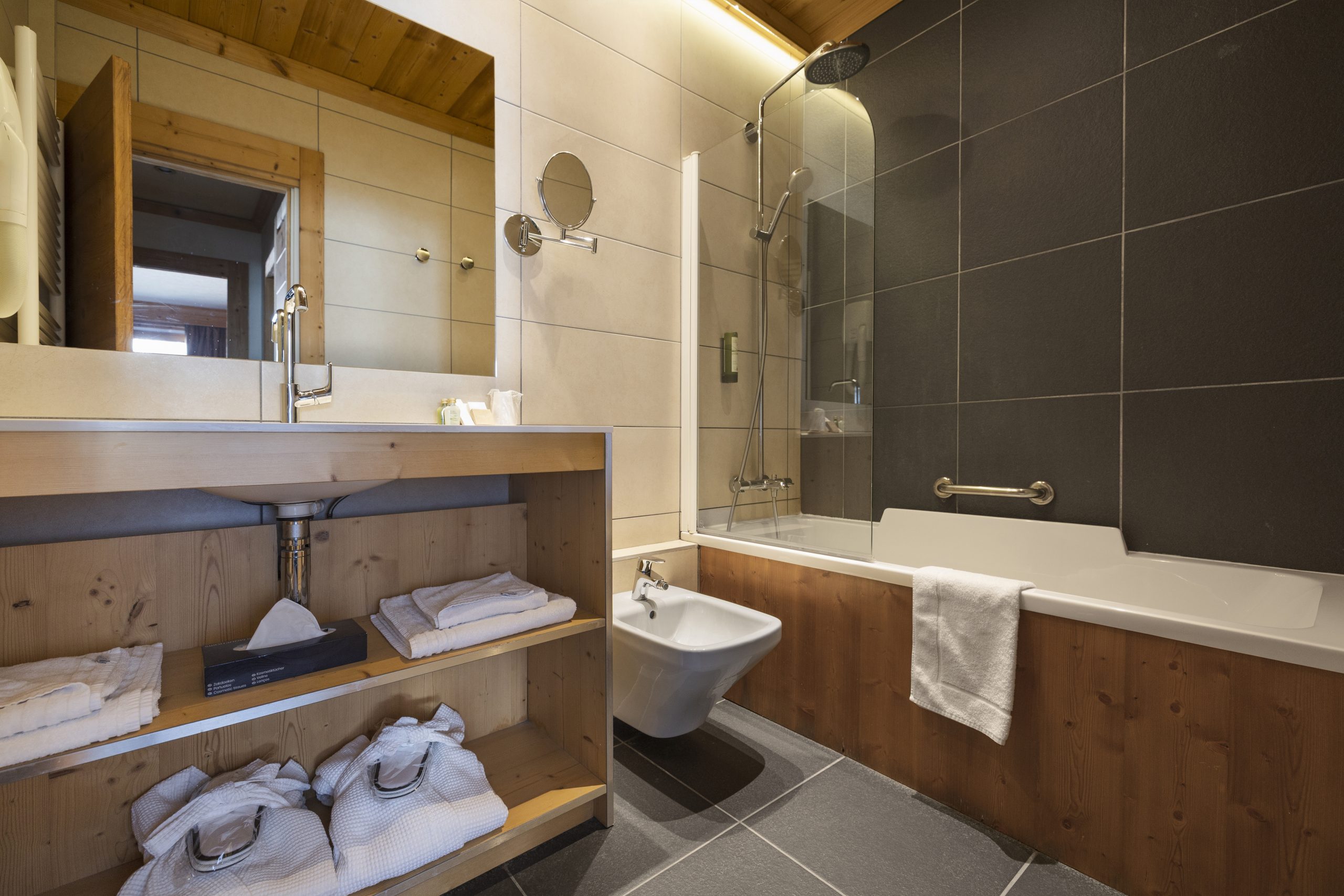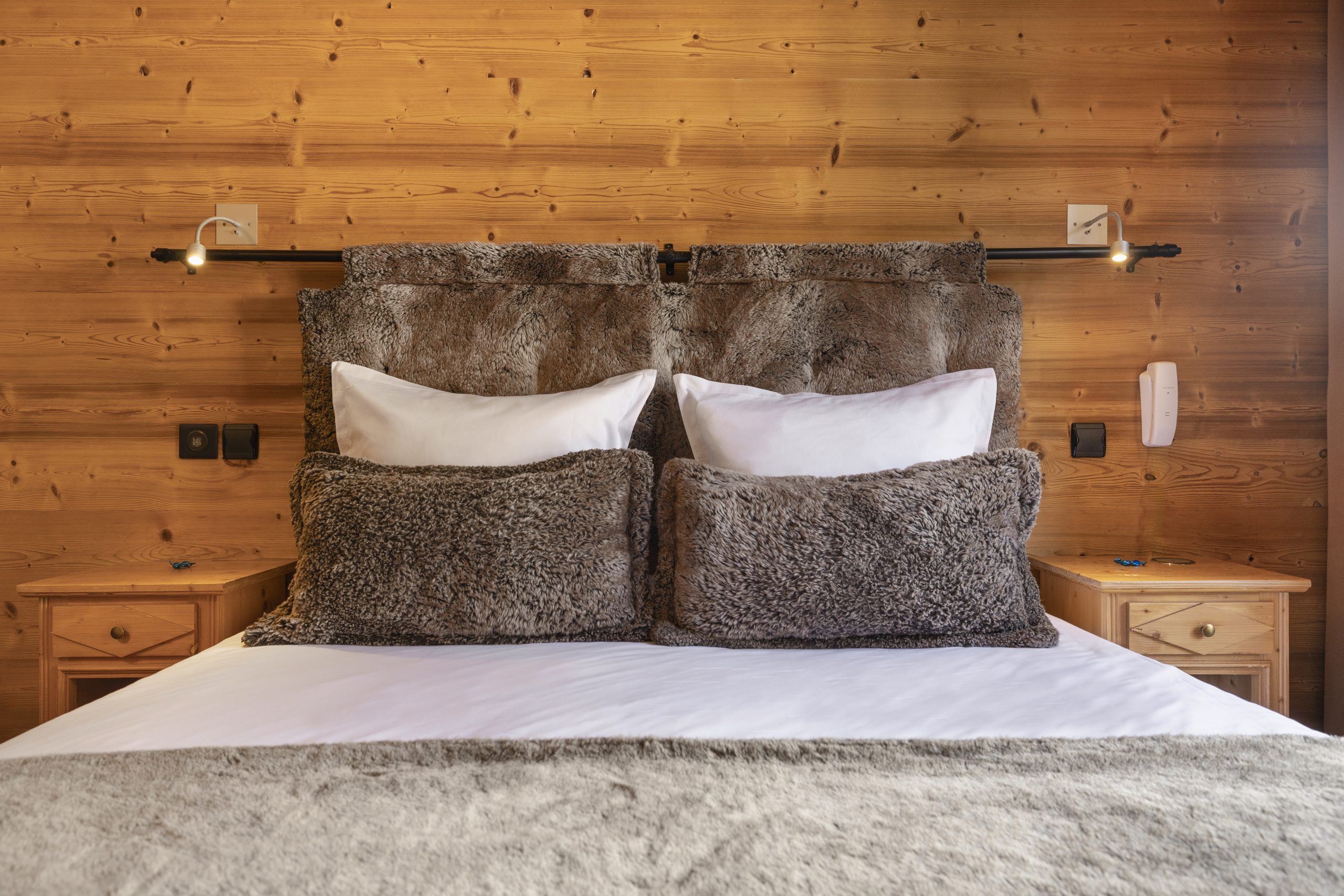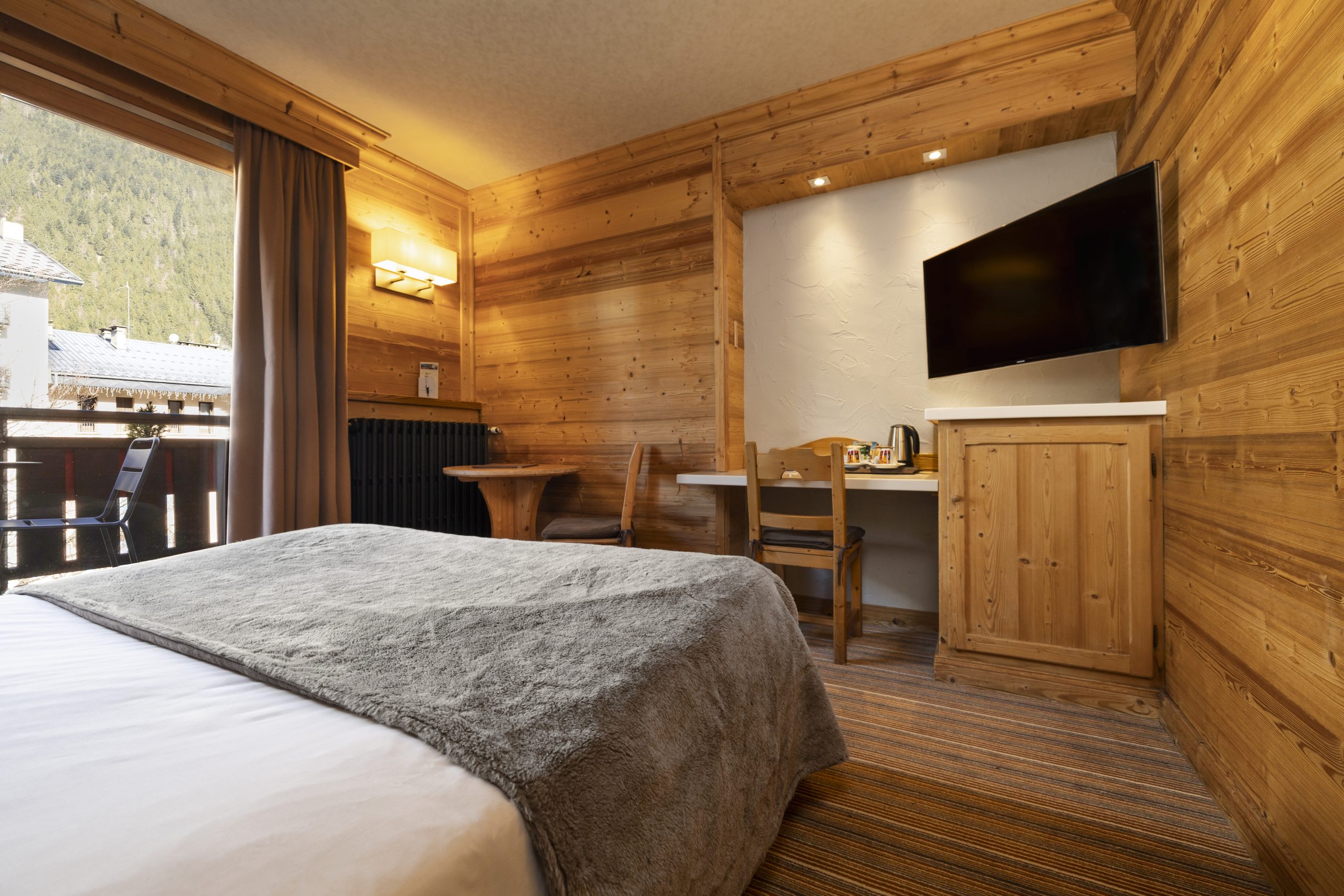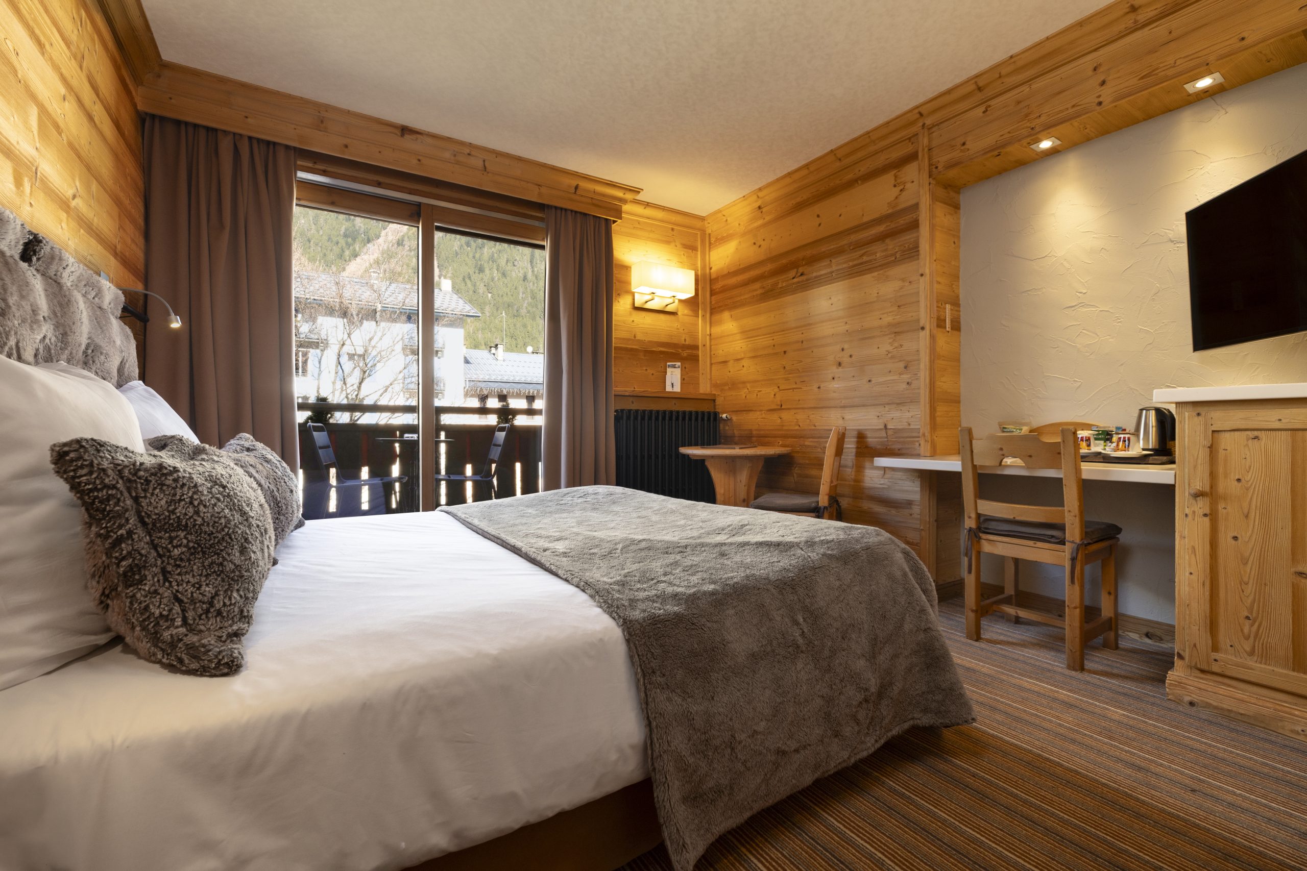Les Chambres Supérieures d’une surface d’environ 20m2 peuvent bénéficier d’un balcon et disposent d’une vue sur Le Brévent ou le Mont Blanc dans une ambiance savoyarde authentique et cosy.